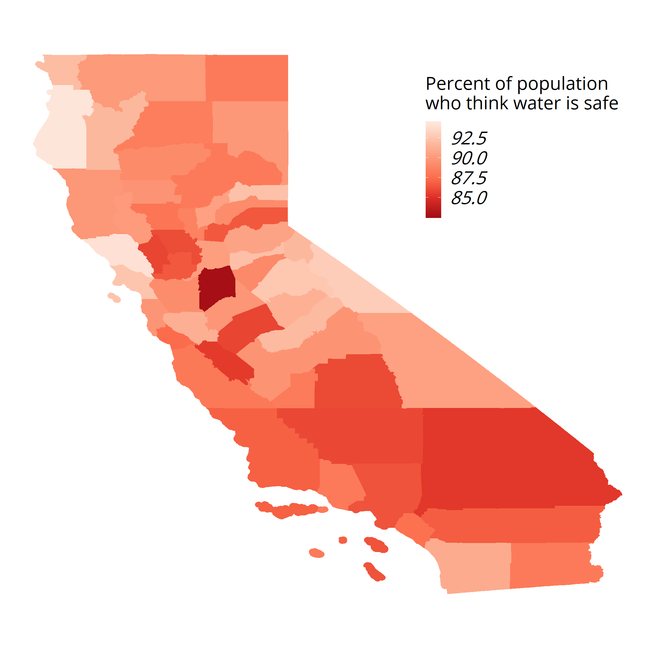 Instead, we developed our own model using the AHS data to estimate water quality perception for each county in California. In this model, we essentially build “fake counties” by sampling responses in the survey. We sample the AHS survey until the fake county matches the county’s true demographics on a set of sociodemographic characteristics that were shown in the report to influence an individual’s perception of water safety— things like ethnicity, homeownership, or education. Therefore, water quality perception in this map is based on these demographics.