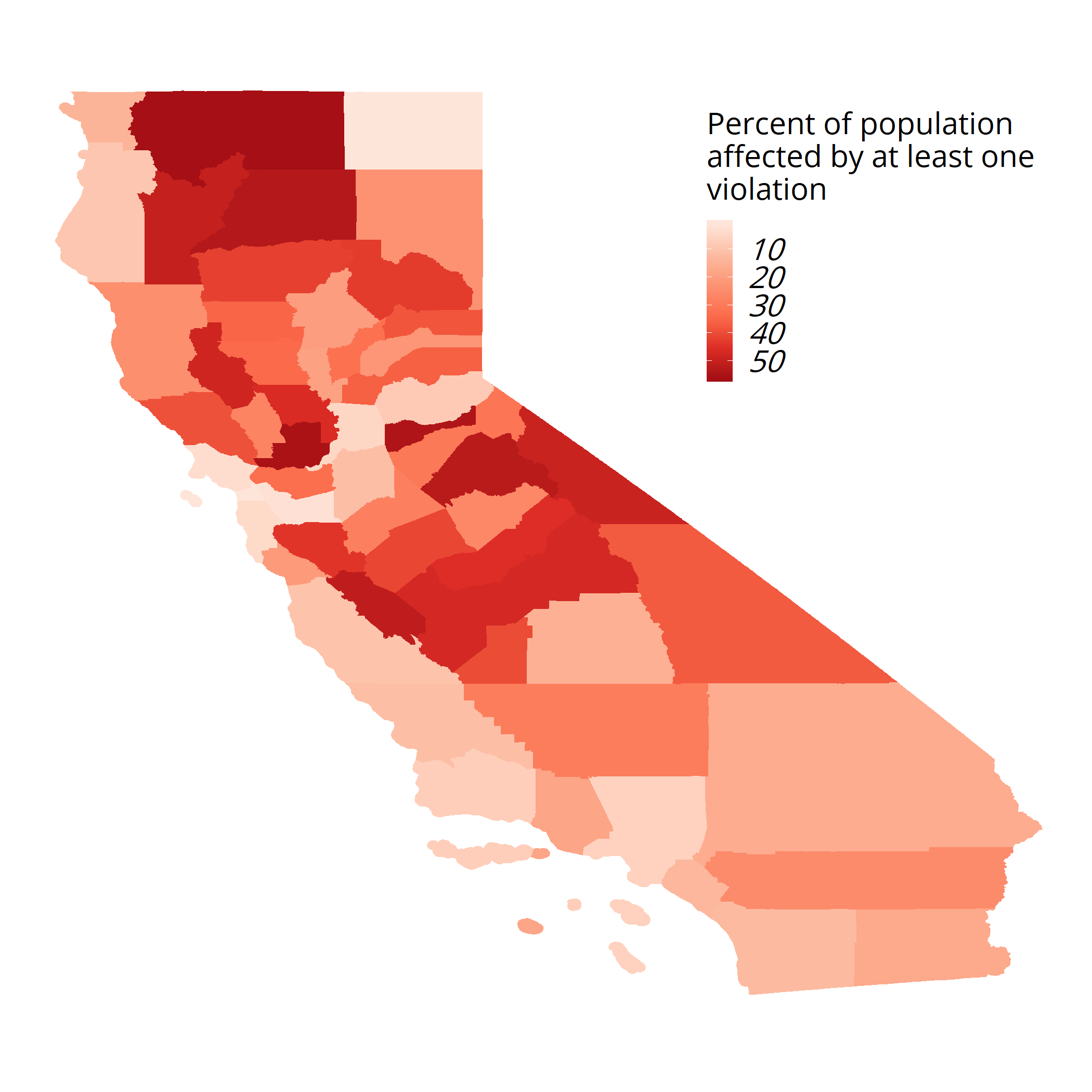 Source: California Water Boards, 2017 Annual Compliance Report for Public Water Systems. This data set contains information about all reportable non-compliance events in a public water system, as well as the population served by the affected water system. Percentage of population affected by at least one water quality violation was calculated by summing the total population served by each water system with at least one violation, divided by the total population of the county. Alpine County (pop. 1120) was removed, as the Annual Compliance Report indicates that the Bear Creek (pop. 290) water system serves 2650 individuals, suggesting that 237% of the population was affected. Note that this graph does not reflect water quality problems experienced by people served by private well or other non-public water system, as well as water quality issues or potential contaminants that do not fall under state reporting requirements.